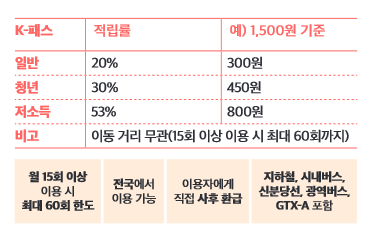 K-패스는 월 15회 이상 정기적으로 시내버스, 지하철 등 대중교통 이용 시 지출 금액의 일정 비율을 다음 달에 돌려 받을 수 있는 교통카드입니다.